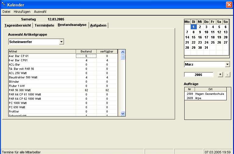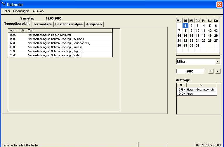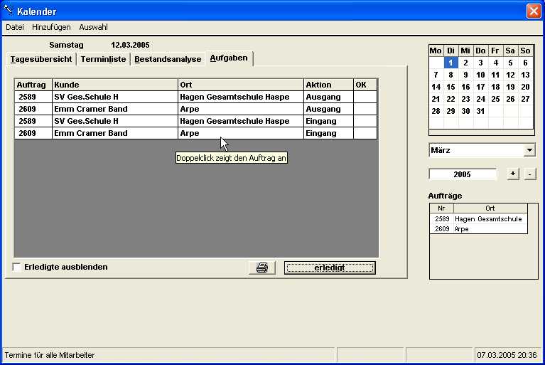 Der Terminkalender lässt sich nach Mitarbeitern filtern. In der Statuszeile wird der Filterstatus angezeigt. Alles was sich aus den erfassten Aufträgen ableiten lässt wird automatisch angezeigt.
